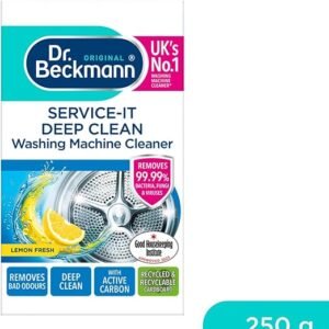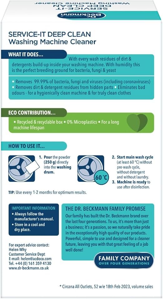 Dr. Beckmann service-it deep clean washing machine cleaner powder not only cleanses your machine but also kills 99.99 % of bacteria, viruses and fungi, leaving your washing machine hygienically clean and smelling fresh. Every time you wash deposits of dirt and detergent settle in your washing machine. This causes unpleasent damp smells and often mould on door seals and in detergent drawers. It is important to hygenically clean the the machine which helps you clean!